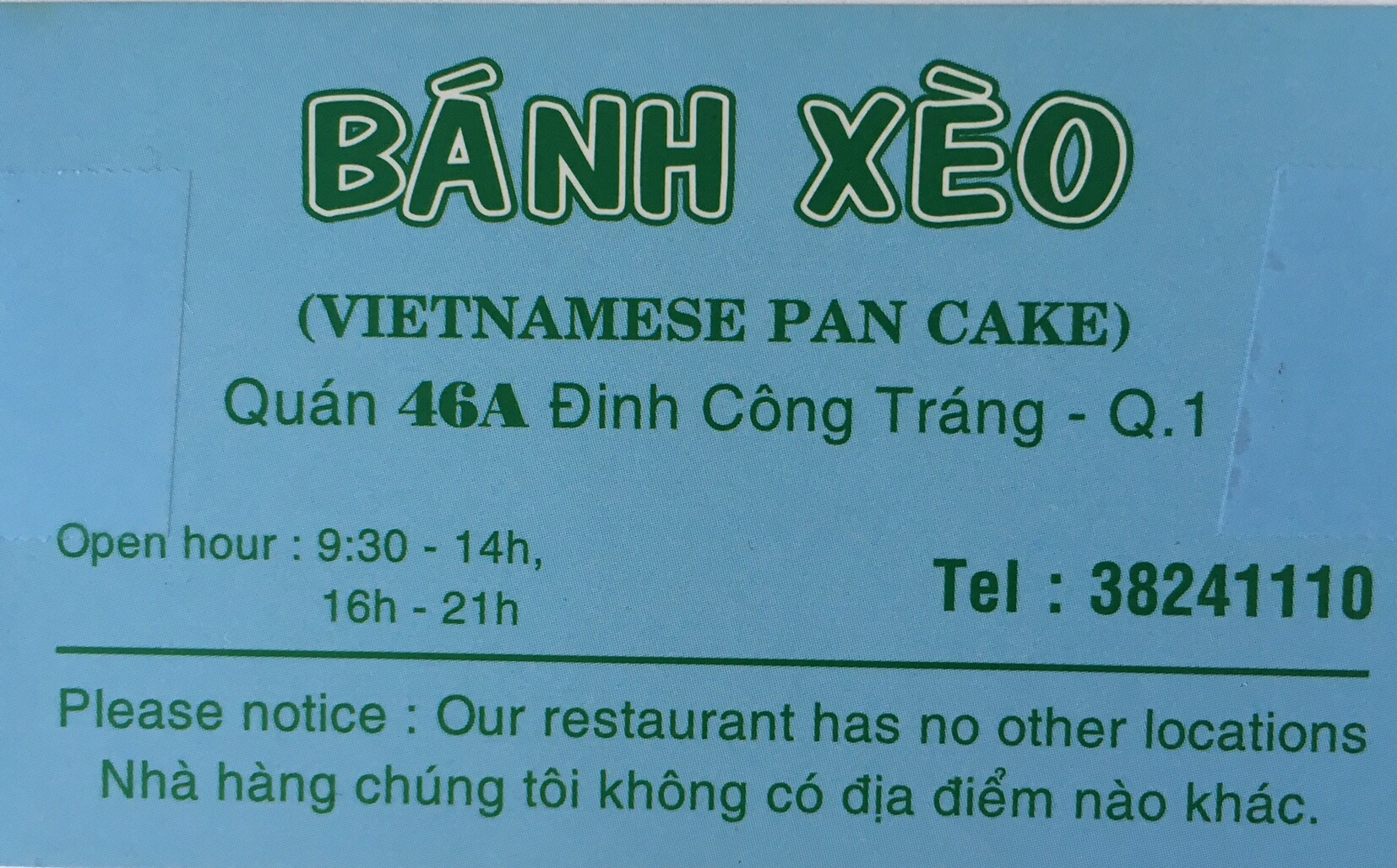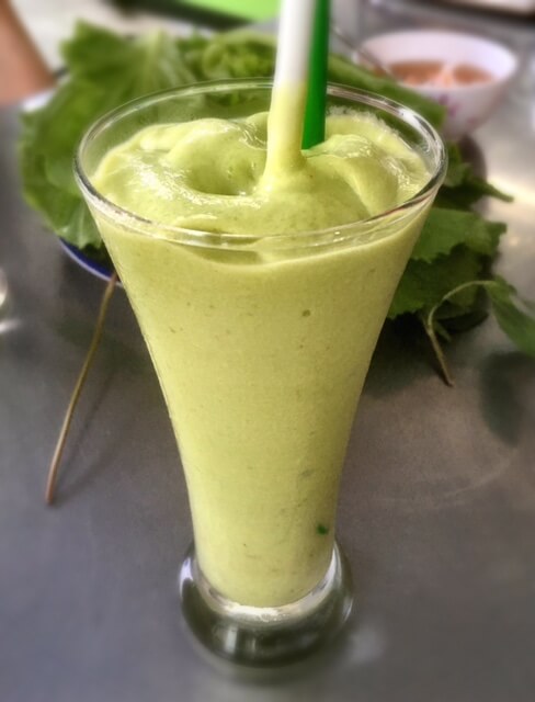 La fameuse crêpe Ban Xeo dont je vous parlais ici. Au sein du District 3, cette enseigne est une référence ! Elle figure d’ailleurs dans bon nombre de guides … La spécialité de ce restaurant est une crêpe de riz pliée en 2 parfaitement croustillante (donc bien frite!!!) garnie de pousses de soja, crevettes et viande de porc. On choisit les ingrédients que l’on souhaite mettre dedans. Pour moi ce sera la totale ! Puis on vient enrouler un petit bout de crêpe avec la multitude d’herbes mises à notre disposition ; du shiso vietnamien (ti to), des feuilles de moutarde, du basilic thai, et des grosses feuilles de laitue! Croyez moi ce plat est un voyage culinaire à lui tout seul. Pour les boissons, j’ai beaucoup aimé mon jus d’avocat 🙂
